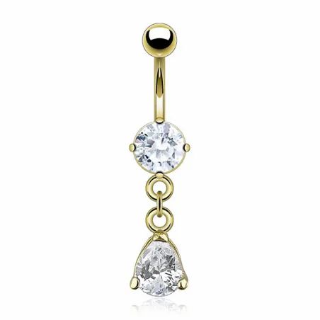Piercing de nombril en titane doré à l’or 24K (procédé PVD), orné de deux zircons étincelants. Un bijou raffiné, hypoallergénique et résistant, idéal pour un éclat durable.