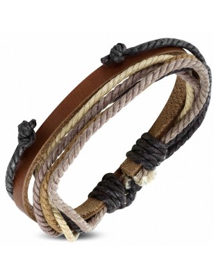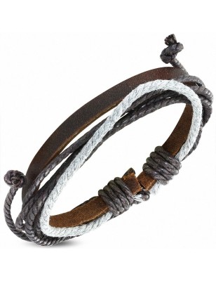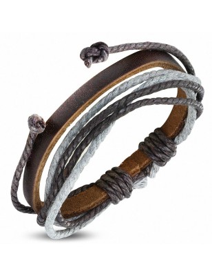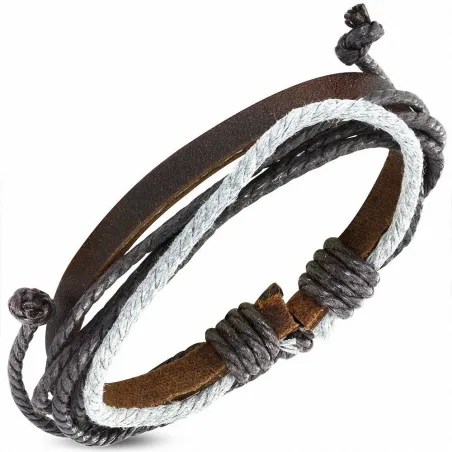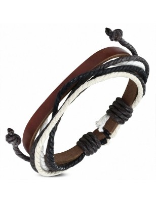 Bracelet pour hommes en cuir noir, avec des cordes bleues et blanches.