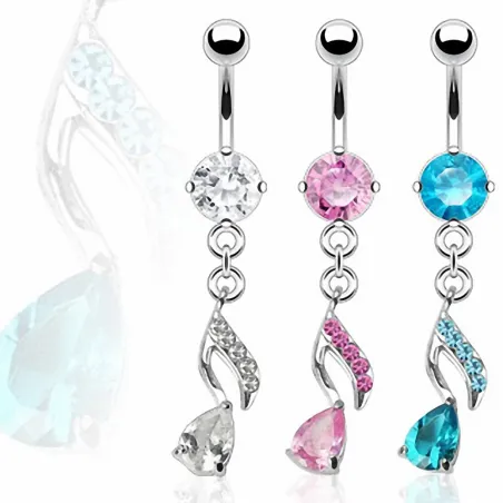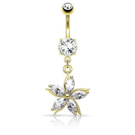 Piercing de nombril en titane doré à l’or 24K (procédé PVD), orné de deux zircons étincelants. Un bijou raffiné, hypoallergénique et résistant, idéal pour un éclat durable.