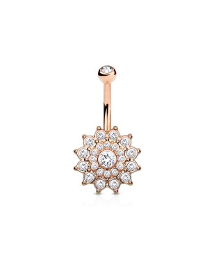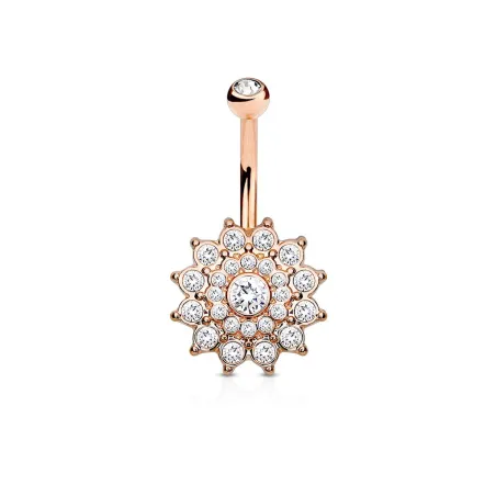 Piercing pour le nombril, en acier chirurgical 316L, plaqué de couleur or rose, serti de deux pierres en zirconium blanc et avec un pendentif représentant un motif floral serti de pierres en marquises.