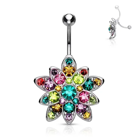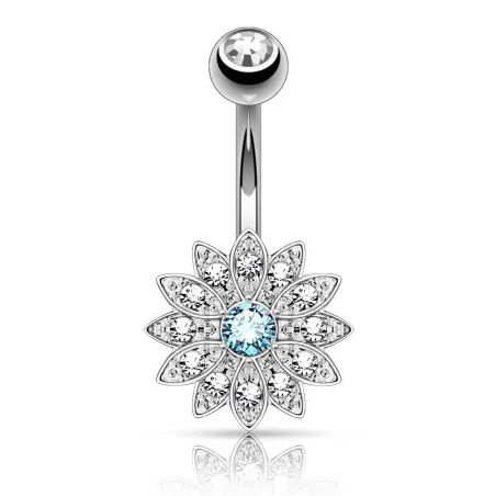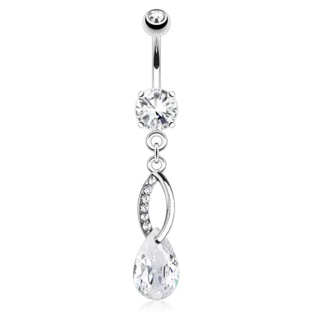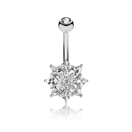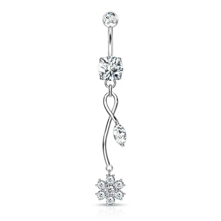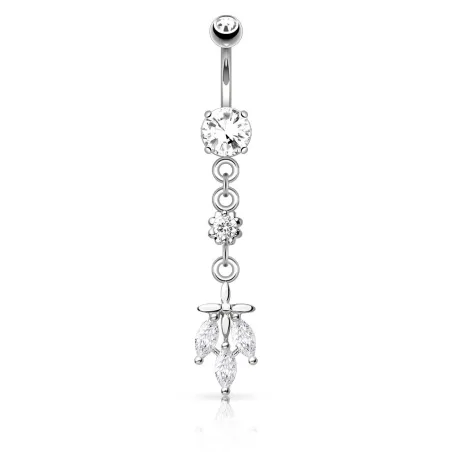 Piercing pour le nombril, en acier chirurgical 316L, serti de deux pierres en zirconium blanc, avec un pendentif représentant un motif floral serti de pierres en marquises.