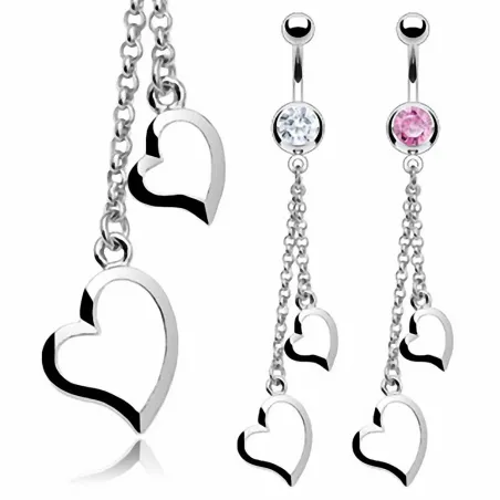 Piercing pour le nombril, en acier chirurgical 316L, représentant trois coeurs : un argenté, un serti d'un zircon noir, et un dernier serti d'un zircon blanc.