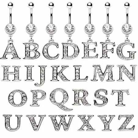 Piercing pour le nombril en acier chirurgical, avec un pendentif représentant une lettre de l'alphabet.