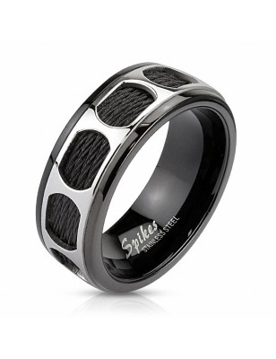 Bague en acier inoxydable noir, représentant des cercles et des câbles.