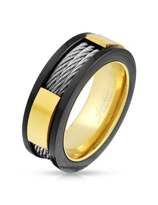 Bague pour homme en acier inoxydable, représentant des câbles insérés sur deux rangées, délimitées par des lignes noires.