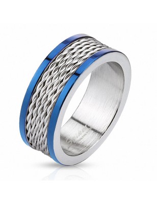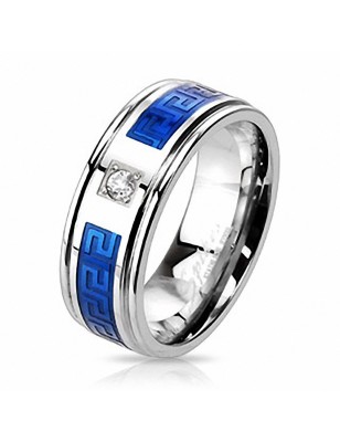 Bague pour hommes en acier, représentant un labyrinthe bleu, et serti d'un strass.