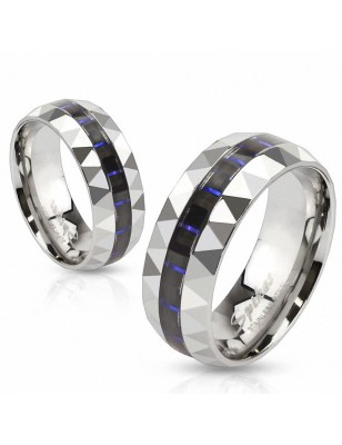 Bague pour homme et femme, en acier inoxydable à facettes, avec de la fibre de carbone noire et bleue insérée au centre de l'anneau.