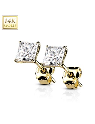 Paire de boucle d'oreille type clous en or 14K avec une pierre carrée de couleur claire.