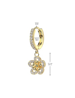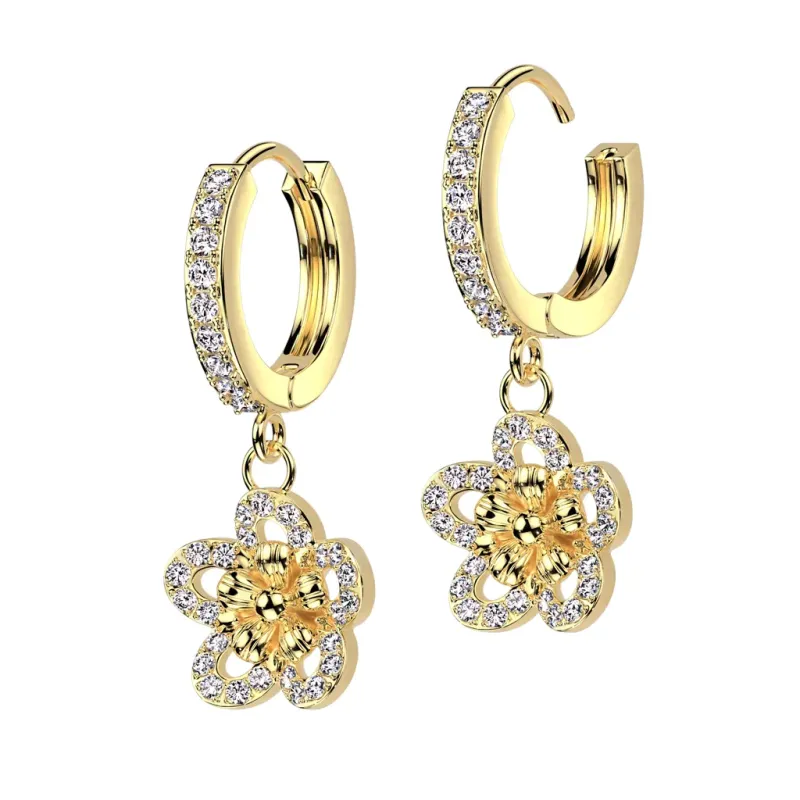 Paire de boucles d'oreilles, en acier chirurgical 316L, plaqué or 14 carats, en forme d'anneaux pavés de zirconiums avec pendentif représentant une fleur.