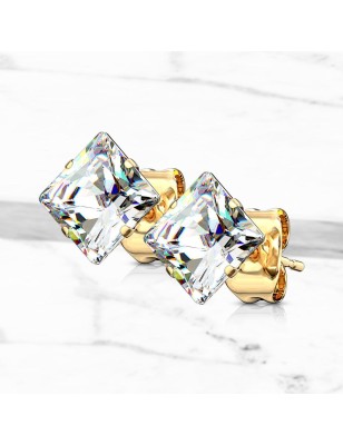 Paire de boucle d'oreille en acier inoxydable Plaqué Or, de type "clous", serties d'une pierre carrée de couleur claire.