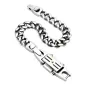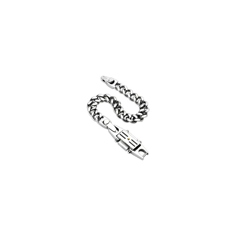 Bracelet en acier inoxydable avec une plaque rectangulaire représentant un design moderne.