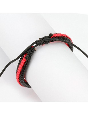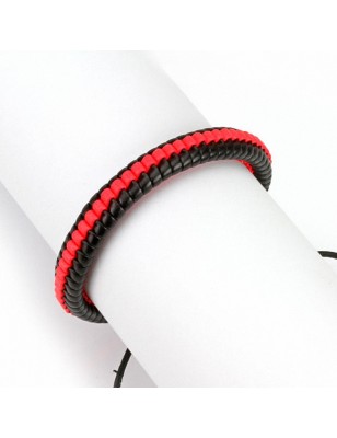 Bracelet pour hommes en cuir noir, avec une corde rouge entrelacée au centre.