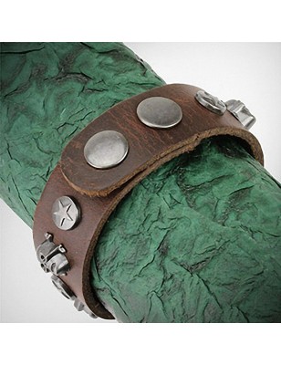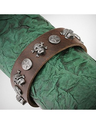 Bracelet pour hommes en cuir marron, représentant des crânes et des étoiles.