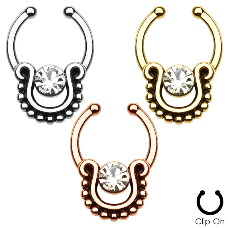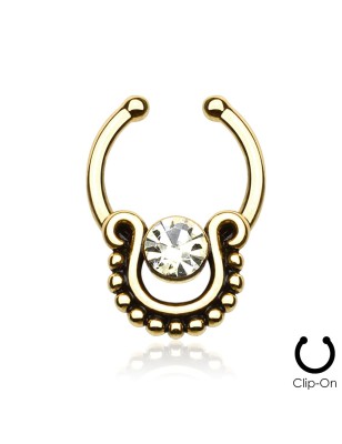 Faux piercing pour le septum, qui se clipse, serti d'une pierre solitaire en zircon claire.