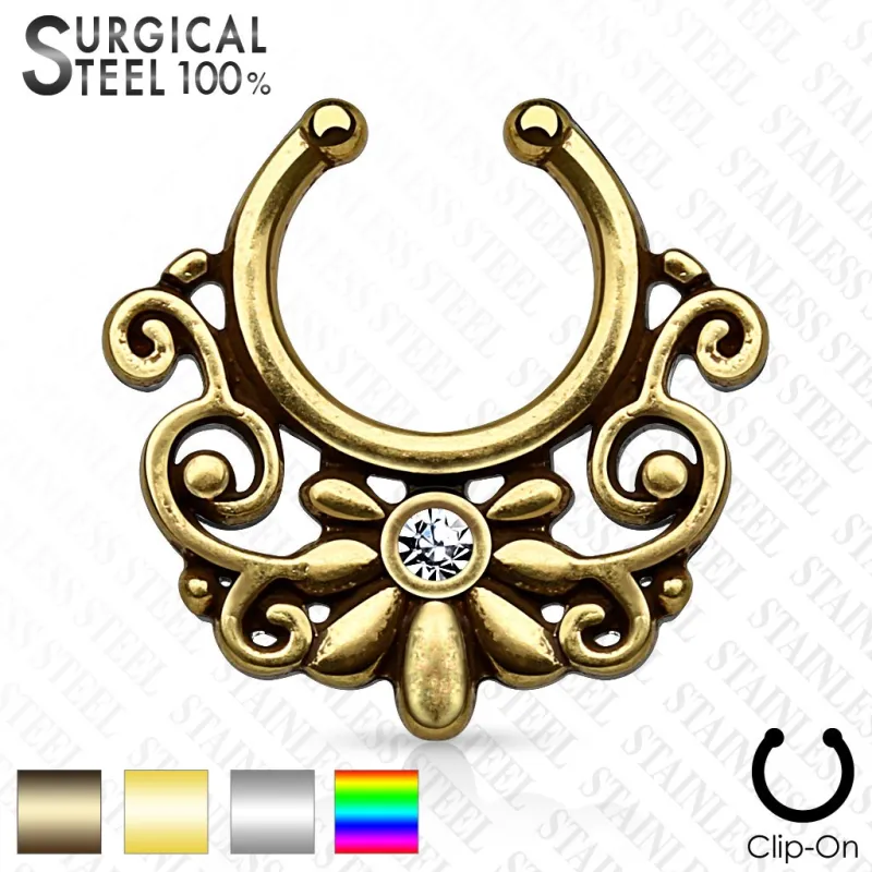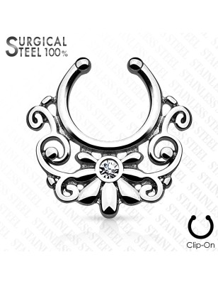 Faux piercing pour le septum, qui se clipse, représentant un motif floral d'inspiration tribale.