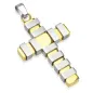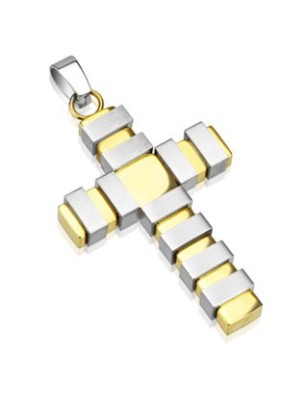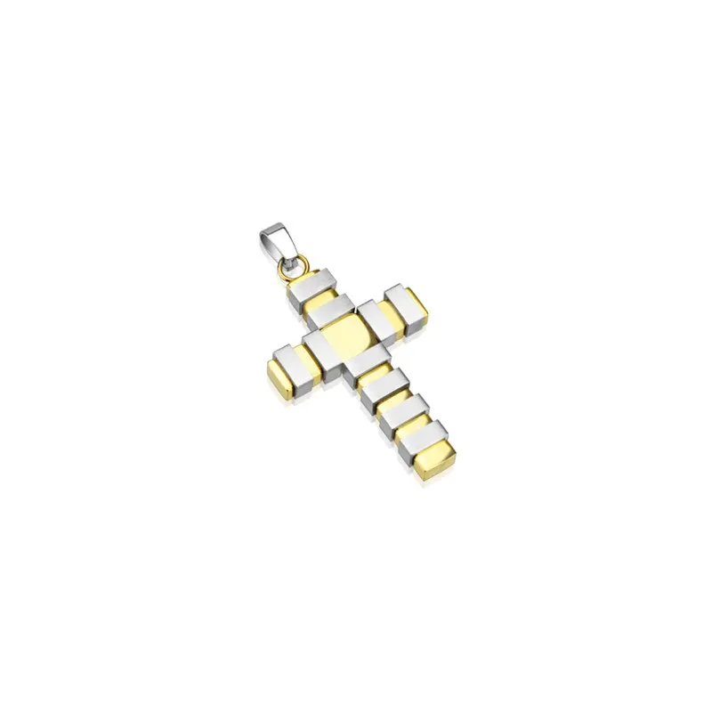 Pendentif en acier inoxydable représentant une croix, formée de plusieurs bandes, argentées et dorées.