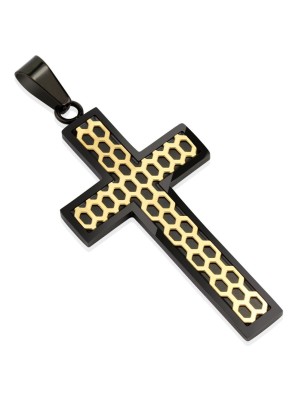 Pendentif représentant une croix noire, avec motif nid d'abeille doré.