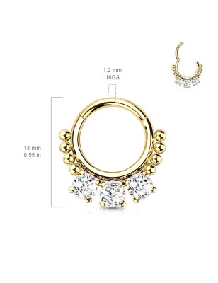 Piercing en anneau clipsable, en acier chirurgical 316L de qualité haute précision, plaqué de couleur dorée, et représentant des perles et serti de trois pierres en zirconium blanc.