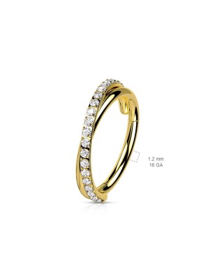 Piercing anneau articulé, en acier chirurgical doré, de qualité haute précision composé de deux anneaux entrecroisés dont l'un est pavé de petites pierres en zirconium blanc.