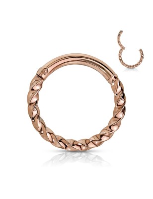 Piercing anneau articulé, en acier chirurgical 316L de qualité haute précision, plaqué de couleur or rose, avec une tranche pavée de pierres en zirconium couleur aurore boréale.