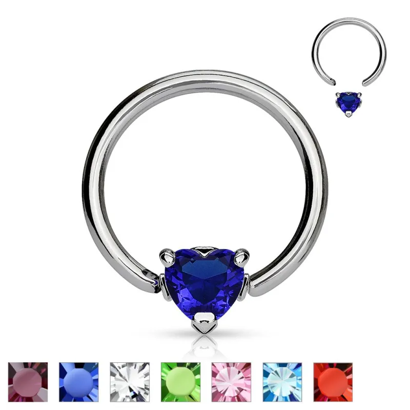 Piercing de type "anneau" captif (fermé par une boule), en acier chirurgical, serti d'une pierre Cubic Zirconium solitaire, en forme de coeur.