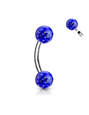 Piercing banane en acier chirurgical, avec deux boules serties de multiples petits cristaux.