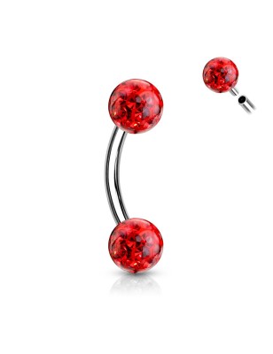 Piercing de type banane, pour l'arcade, en acier chirurgical 316L, avec deux boules serties de multiples petits cristaux de couleur rouge.