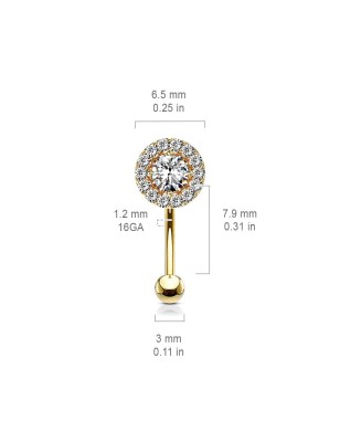 Piercing de type banane pour l'arcade, en acier chirurgical 316L, plaqué or 14 carats, serti d'une pierre ronde en zirconium blanc, entourée de multiples petits strass.