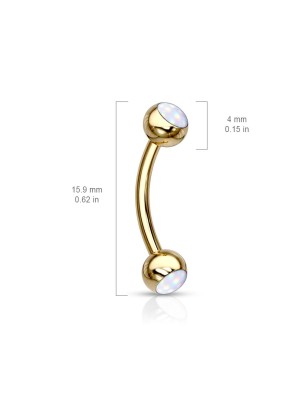 Piercing de type banane, pour l'arcade, en acier chirurgical 316L plaqué de couleur dorée, avec deux boules serties de pierres en époxy effet lumineux, couleur blanche.