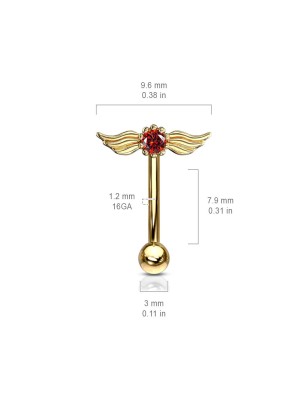 Piercing de type banane pour l'arcade en acier chirurgical 316L, plaqué or, représentant des ailes d'ange, et serti d'un petit cristal de couleur rouge.