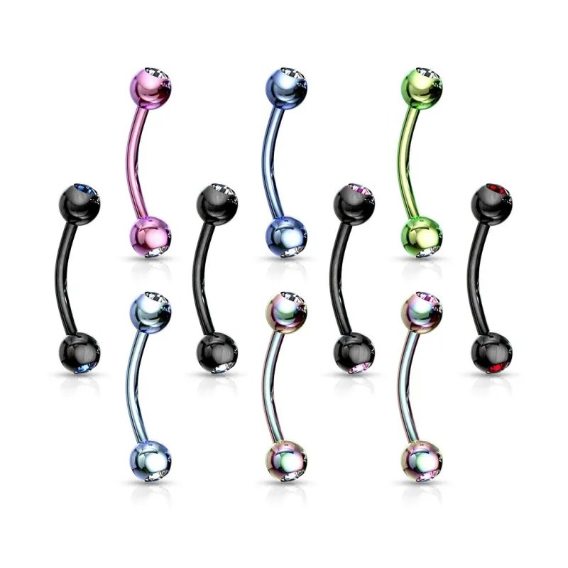 Piercing de type "banane" pour l'arcade, avec des boules, en Titane anodisé (sur de l'acier chirurgical), serties de gemmes.