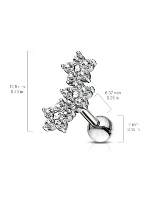 Piercing de type barbell conçu pour le cartilage de l'oreille (helix), en acier chirurgical 316L, représentant trois fleurs, chacune étant serties de cinq cristaux de couleur blanche.