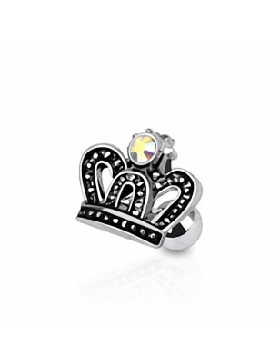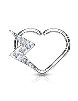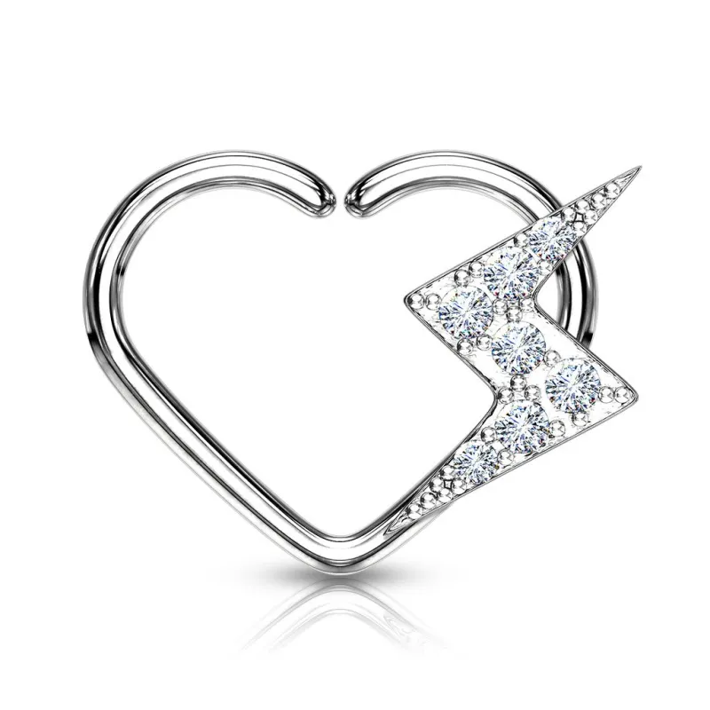 Piercing pour daith et cartilage de l'oreille, plaqué platine, en forme de coeur, représentant un éclair serti de pierres en zirconium blanc.