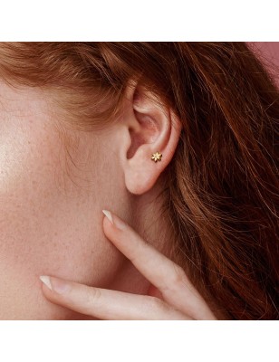 Piercing de type barbell conçu pour le cartilage de l'oreille (helix), en acier chirurgical 316L, avec placage de couleur dorée, représentant une fleur sertie d'une petite pierre en zirconium blanc.