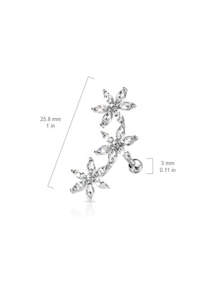 Piercing de type barbell conçu pour le cartilage de l'oreille (helix), en acier chirurgical 316L, représentant trois fleurs serties de pierres en zirconium blanc.