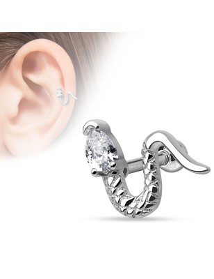 Piercing barbell, pour le cartilage / hélix, en acier chirurgical 316L, représentant un serpent serti d'une pierre en zirconium clair.