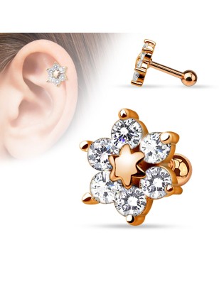 Piercing barbell, pour le cartilage / hélix, en acier chirurgical 316L, couleur or rose, représentant une fleur sertie de 6 pierres en zirconium.