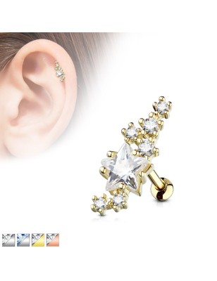 Piercing de type "barbell" conçu pour le cartilage de l'oreille, en acier chirurgical 316L, plaqué or, serti de plusieurs pierres en zirconium dont une est en forme d'une large étoile blanche.