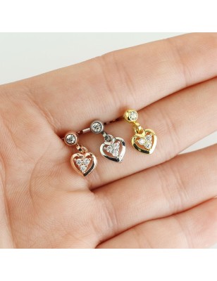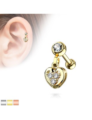 Piercing de type "barbell" conçu pour le cartilage de l'oreille, en acier chirurgical 316L, plaqué or, avec un pendentif en forme de coeur serti de trois gemmes.