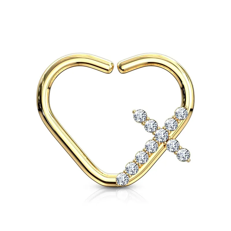 Piercing pour daith et cartilage de l'oreille, plaqué or, en forme de coeur, représentant une croix sertie de pierres en zirconium blanc.