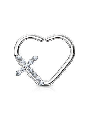 Piercing pour daith et cartilage de l'oreille, en forme de coeur, représentant une croix sertie de pierres en zirconium blanc.