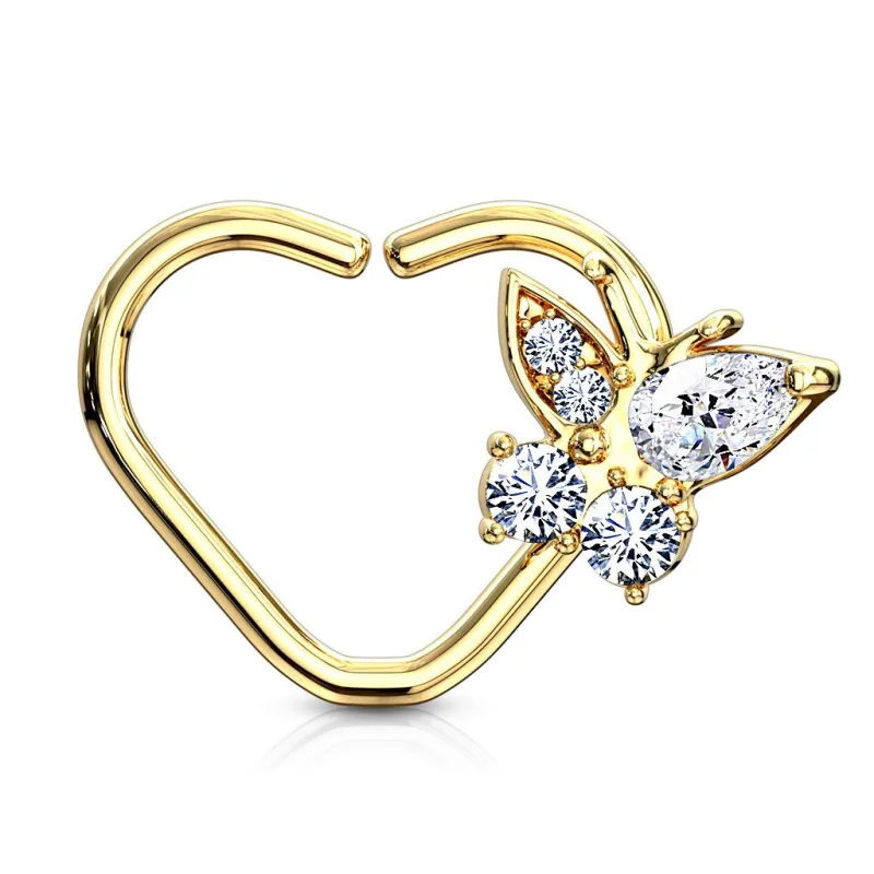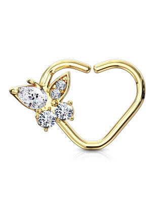 Piercing pour daith et cartilage de l'oreille, plaqué or, en forme de coeur, représentant un papillon sertie de pierres en zirconium blanc.