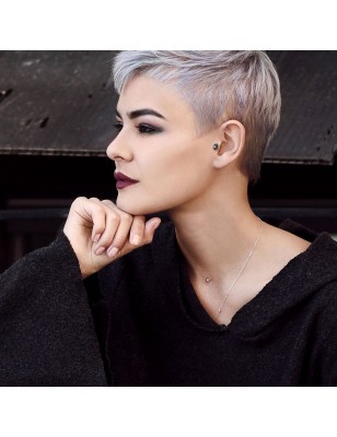 Piercing de type barbell conçu pour le cartilage de l'oreille (helix), en acier chirurgical 316L, représentant une fleur avec aspect antique, serti d'un strass en zirconium couleur aurore boréale.