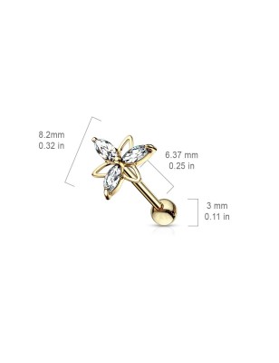 Piercing de type barbell, pour le cartilage / hélix de l'oreille, en acier chirurgical 316L, plaqué or 14K, représentant une fleur avec un triangle, serti de pierres en zirconium blanc.