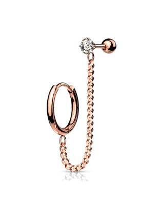 Double piercing pour l'oreille, en acier chirurgical 316L, recouvert d'un placage de couleur rosée, relié entre eux par deux chaines. Un piercing est un barbell et le second un anneau.