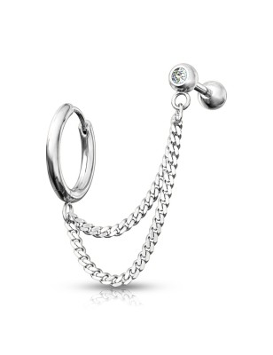 Double piercing pour l'oreille, en acier chirurgical 316L, recouvert d'un placage de couleur multicolore, relié entre eux par deux chaines. Un piercing est un barbell et le second un anneau.