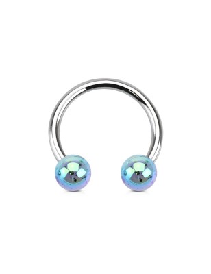 Piercing de type fer à cheval en acier chirurgical avec des billes en acrylique représentant des tâches avec un aspect métallisé.