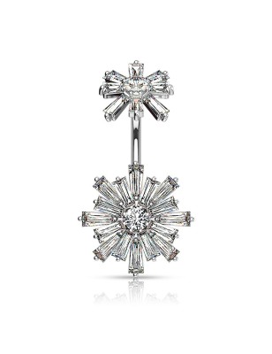 Piercing de type industriel, pour l'oreille, en acier chirurgical 316L, avec une chaine au centre du piercing, reliant trois pierres en zirconium, de forme ronde, et de couleur blanche et turquoise.
