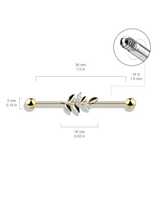Piercing de type industriel, pour l'oreille, en acier chirurgical 316L, plaqué or 14 carats, représentant une feuille sertie de deux pierres en zirconium.