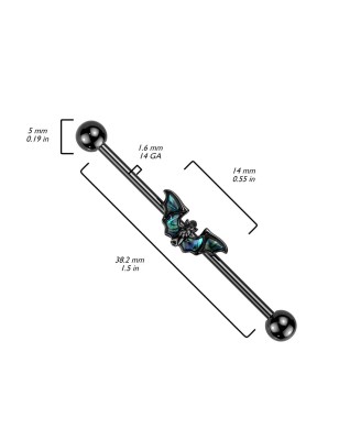 Piercing de type industriel, pour l'oreille, en acier chirurgical 316L, plaqué de couleur noire, représentant une chauve-souris avec insert de nacre abalone.